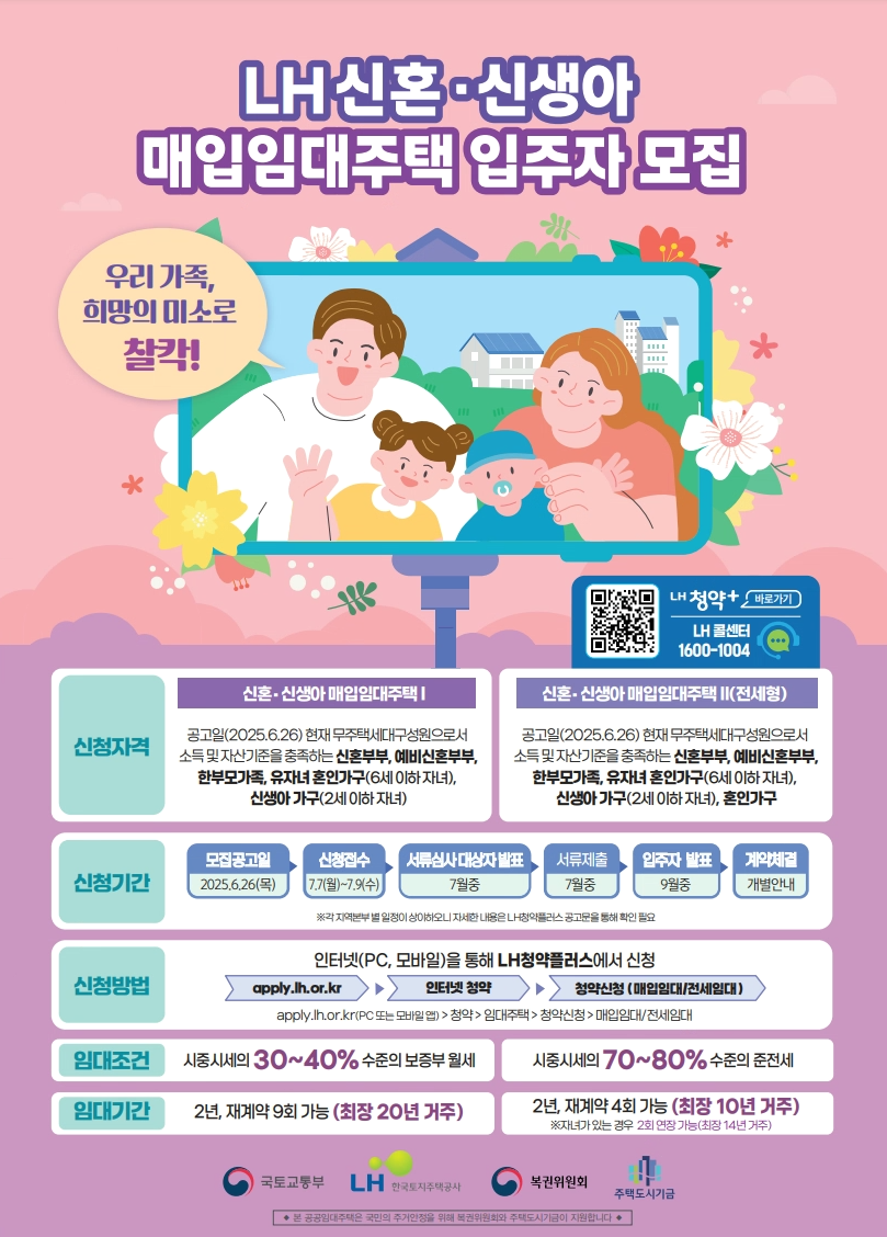 2025 매입임대주택 사업은 자산 축적에 어려움을 겪는 청년, 육아로 주거비 부담이 큰 신혼부부, 신생아 출산 가정 등에게 실질적인 주거 지원을 제공하는 매우 현실적인 정책입니다.