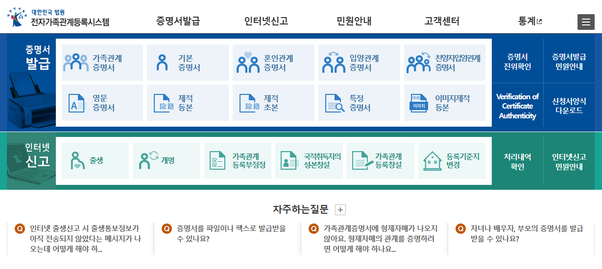 전자문서지갑을 사용하기 위해서는 첫번째로는 '대법원 전자가족관계등록시스템' 검색합니다. 그 후 발급받고 싶은 증명서를 클릭 후 다음페이지로 이동합니다.