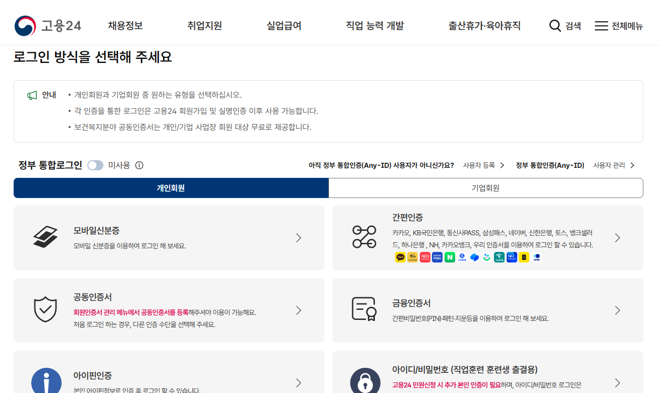 접속 후 로그인 진행하면 됩니다. 인증 방식은 공동인증서, 카카오·네이버·PASS 등 간편인증 중 선택할 수 있습니다.