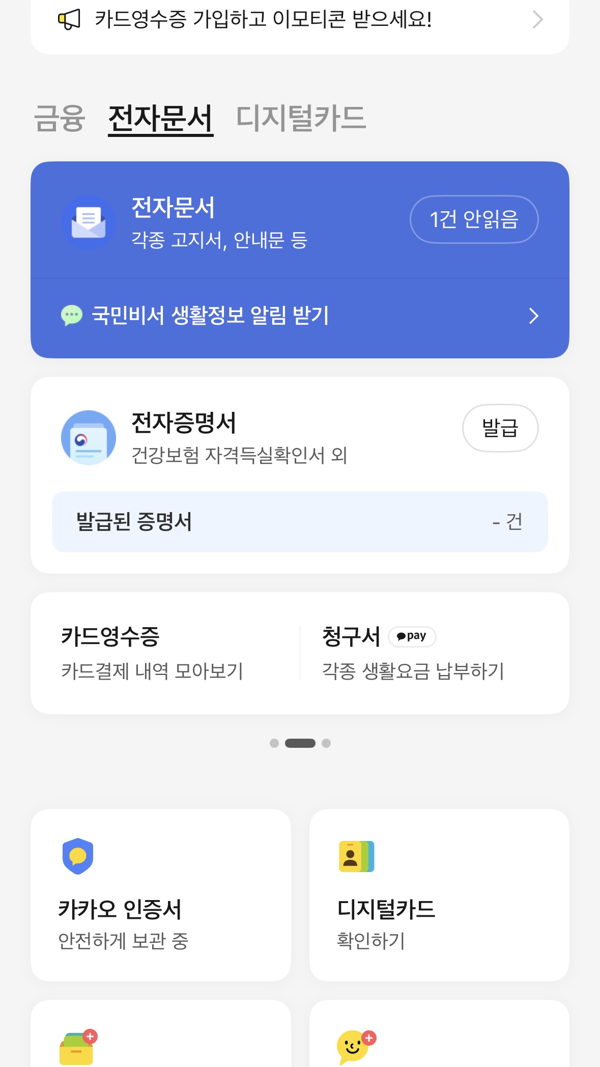카카오톡 앱 접속 후 더보기 누른 뒤, 왼쪽 상단의 지갑 눌러 전자증명서 시작하기를 눌러 발급하면 됩니다.