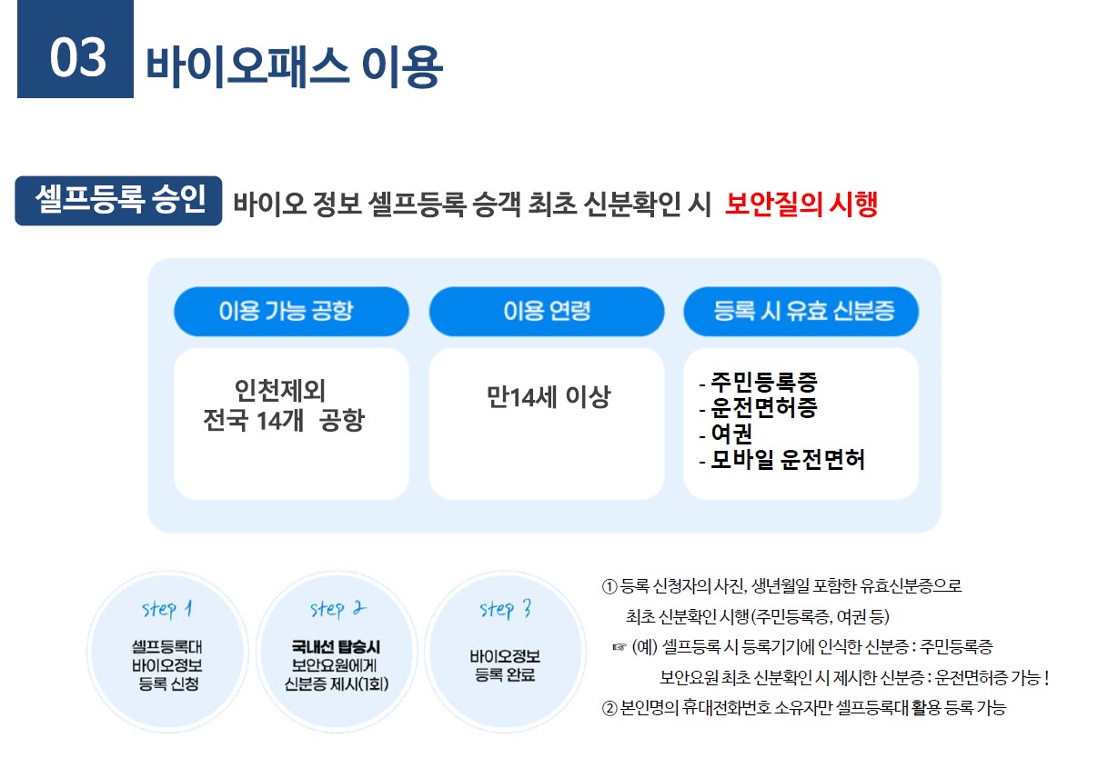 한번만 등록해두면 평생 사용할 수 있다는 점에서 큰 메리트를 가지고 있는 거 같습니다. 최초 1회 사용 시에는 신분증이 필요하고 만 18세 이상은 누구나 국내선 3층 출발장/대합실 중앙 셀프등록대에서 등록할 수 있습니다. 셀프 등록이 어려운 분이나 만 7세 이상 18세 미만의 청소년들은 출발장 유인등록대에서 등록할 수 있습니다.