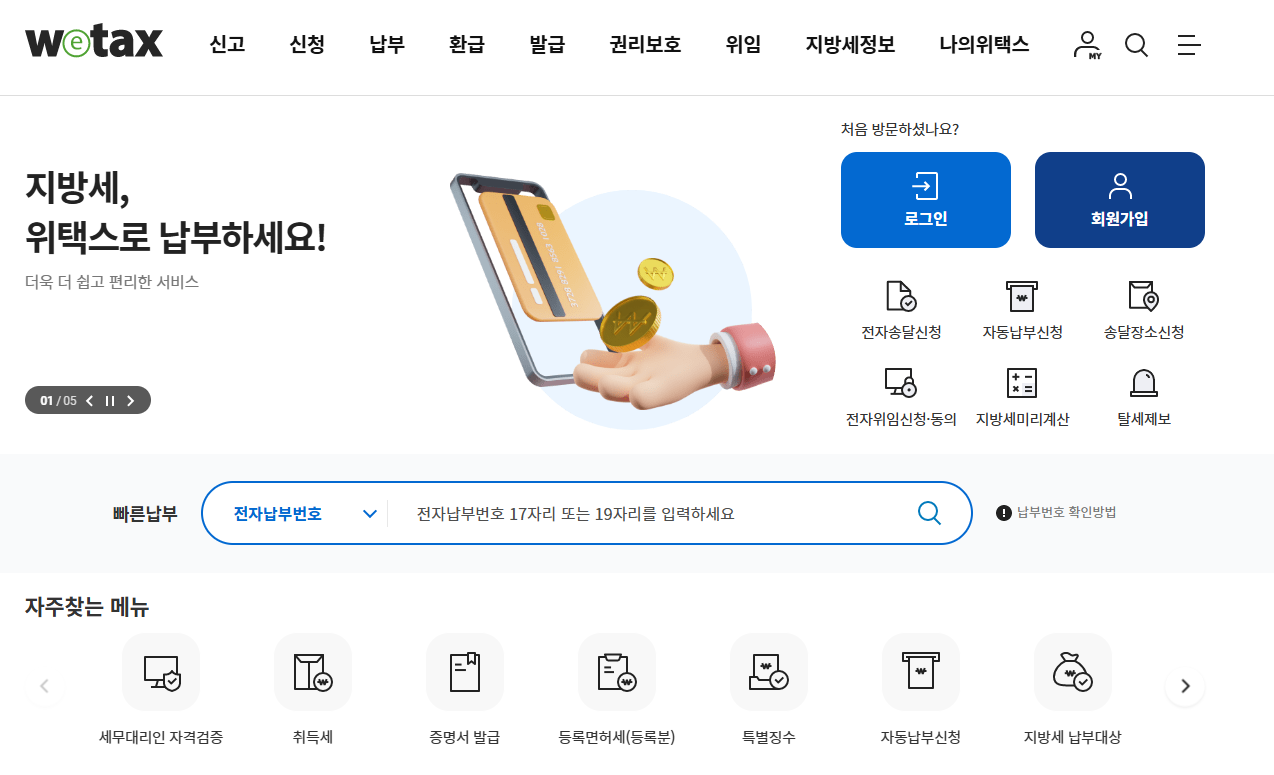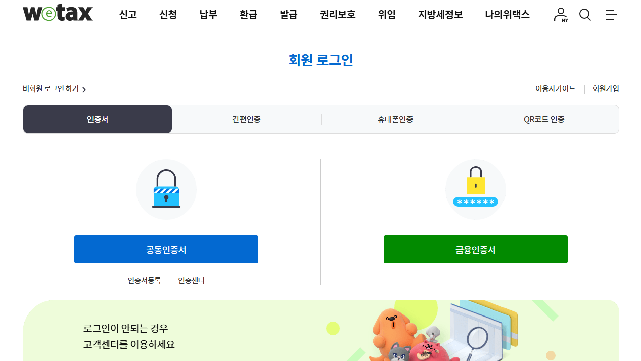 일단 위택스를 접속 후 회원가입 및 공동인증서나 간편인증 등으로 로그인을 해주세요.