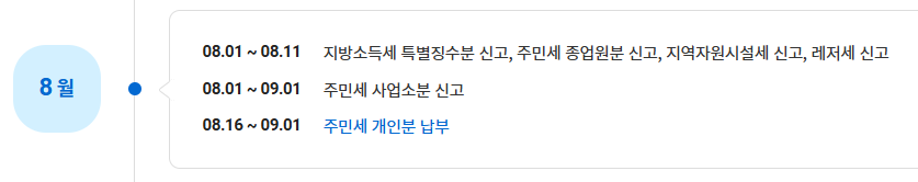 주민세 종업원분 신고는 8월1일부터 11일까지이고, 개인분의 경우 8월 16일부터 8월 31일까지 납부가 가능하며, 사업소분은 8월 1일부터 9월 1일까지 납부해야 합니다.