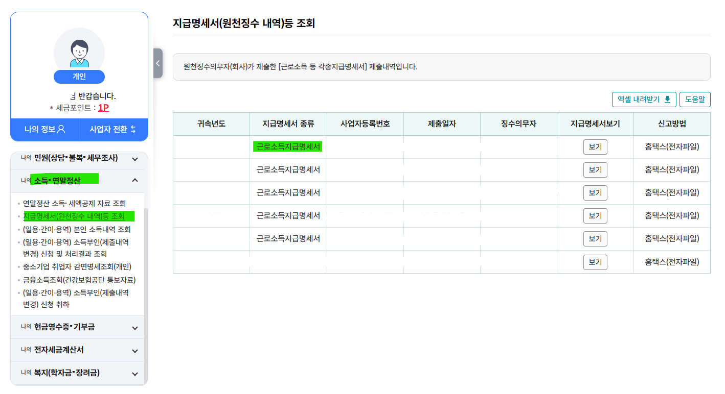 상단 메뉴에서 [나의 홈택스]를 클릭한 뒤, 좌측 항목에서 [나의 소득·연말정산] → [지급명세서·원천징수영수증 내역]을 선택합니다.