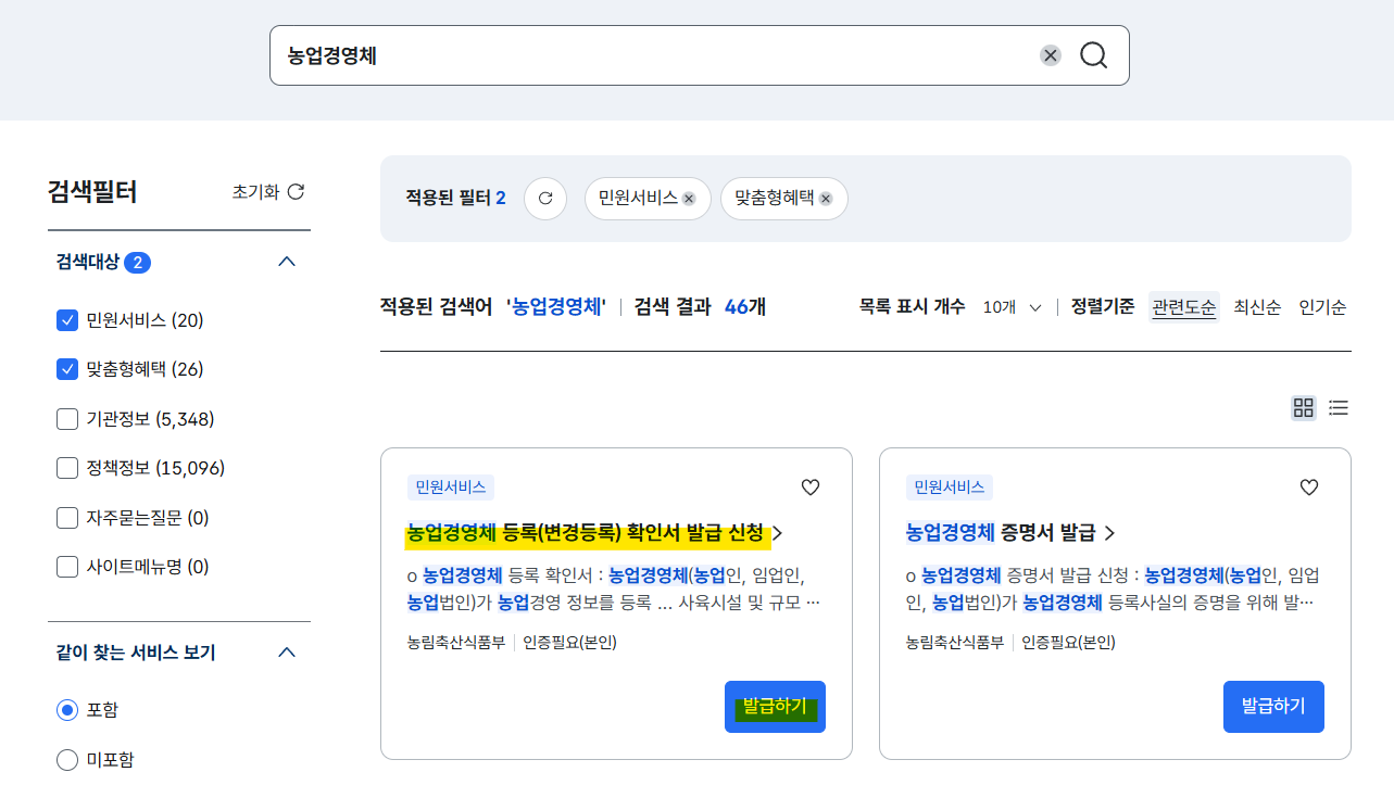 검색결과에서 '농업경영체 등록(변경등록)확인서 발급 신청'에서 발급하기를 눌러줍니다.