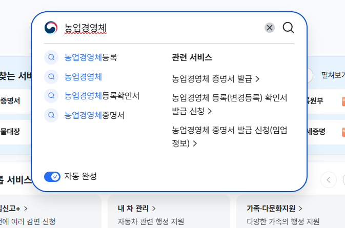 로그인을 하셨다면 메인화면 검색창에 ‘농업경영체’라고 검색을 합니다.