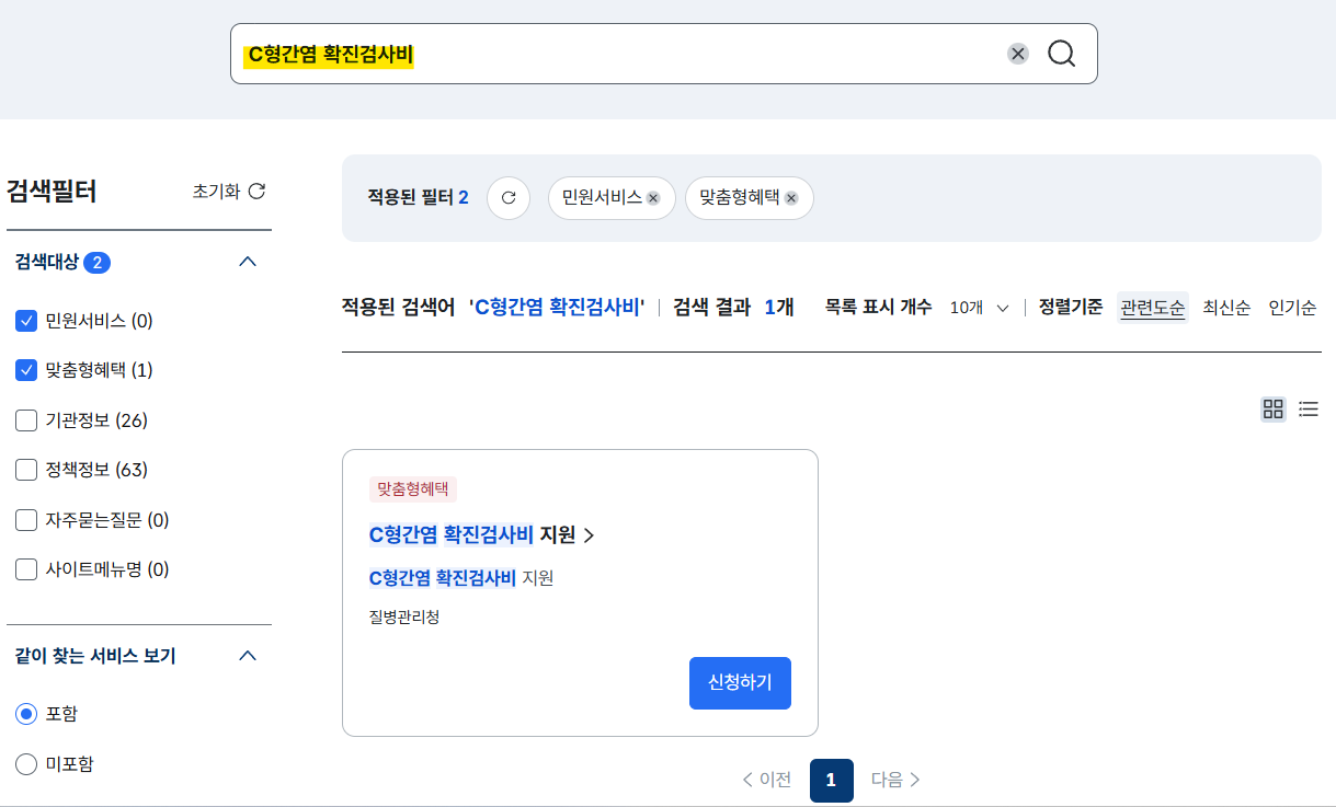 먼저 정부24 접속 후 검색창에 'C형간염 확진검사비'라고 검색합니다.