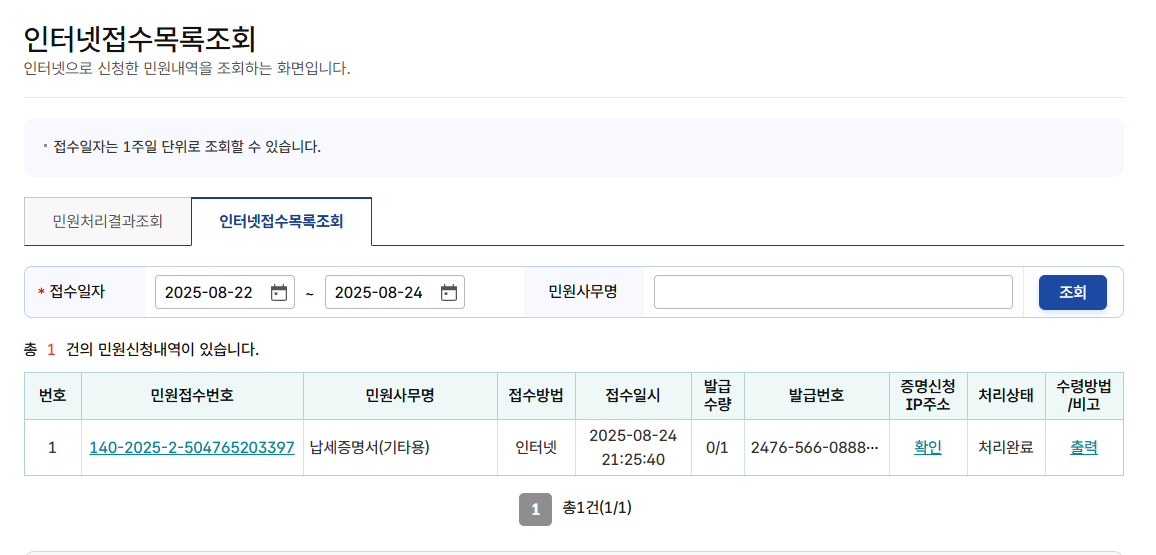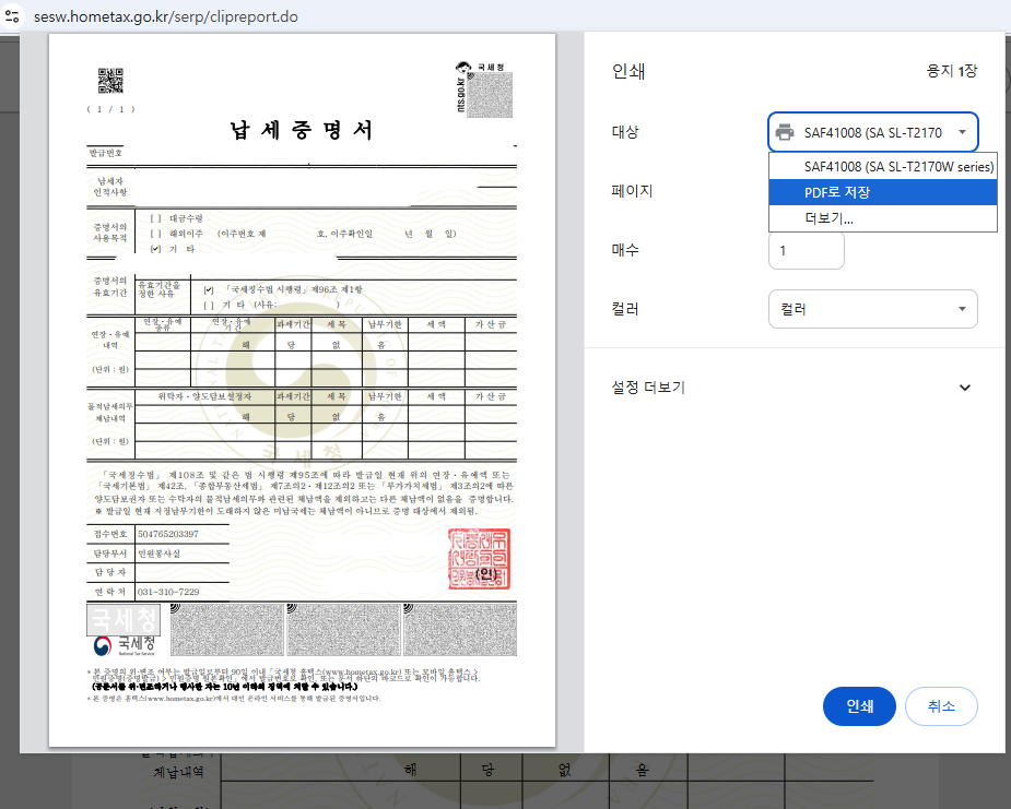 신청을 하고나면 즉시 발급 신청이 완료됩니다. 출력을 눌러서 바로 인쇄를 해도되고 pdf파일로 저장도 가능하여 보관해두셔도 됩니다.