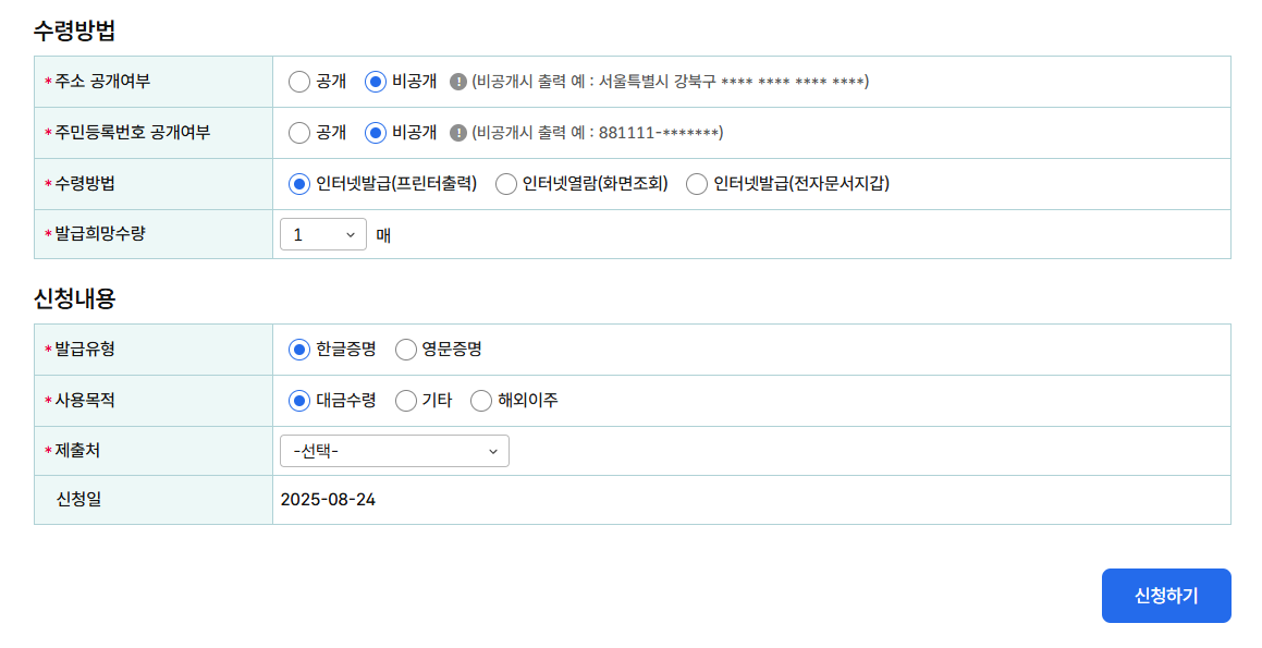 기본 인적 사항은 자동입력이 되고, 수령방법, 신청내용은 용도에 맞게 정보를 체크하시고 '신청하기'를 눌러주세요.