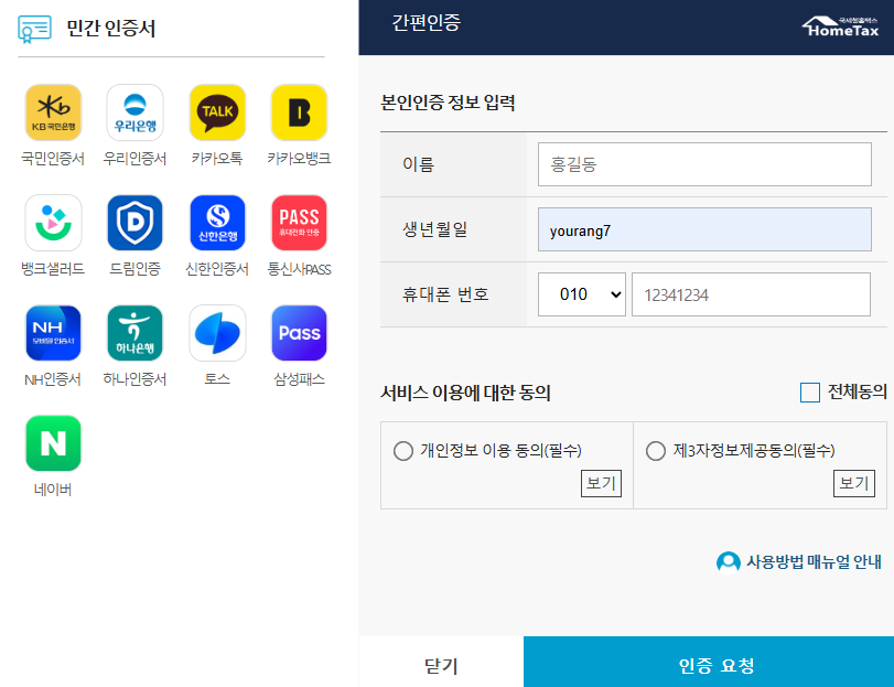 메인 화면에서 '즉시발급 증명'- '납세증명서(국세완납증명)' 을 클릭한 후, 본인 인증을 위해 로그인을 진행합니다. 저는 개인적으로 간편인증을 사용하는데 더 빠르게 로그인이 가능한 거 같습니다.