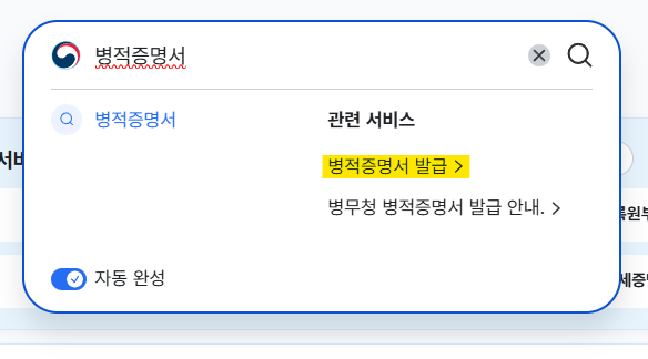 정부24 홈페이지에 접속한 후 검색창에 '병적증명서'라고 검색합니다. 관련서비스에서 '병적증명서 발급'을 클릭합니다.