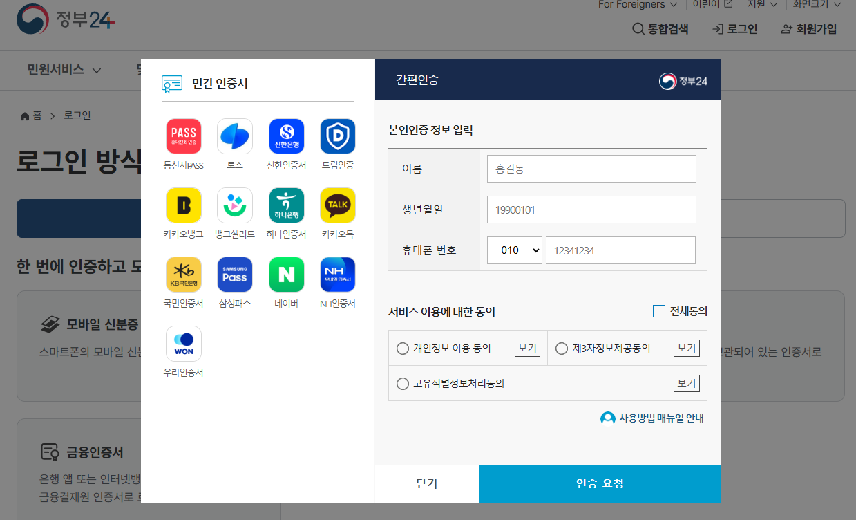 페이지가 이동했다면 발급하기 버튼을 클릭한 후 본인인증 및 로그인을 진행합니다. 저는 간편인증이 빠르고 편해서 간편인증으로 로그인하였습니다.