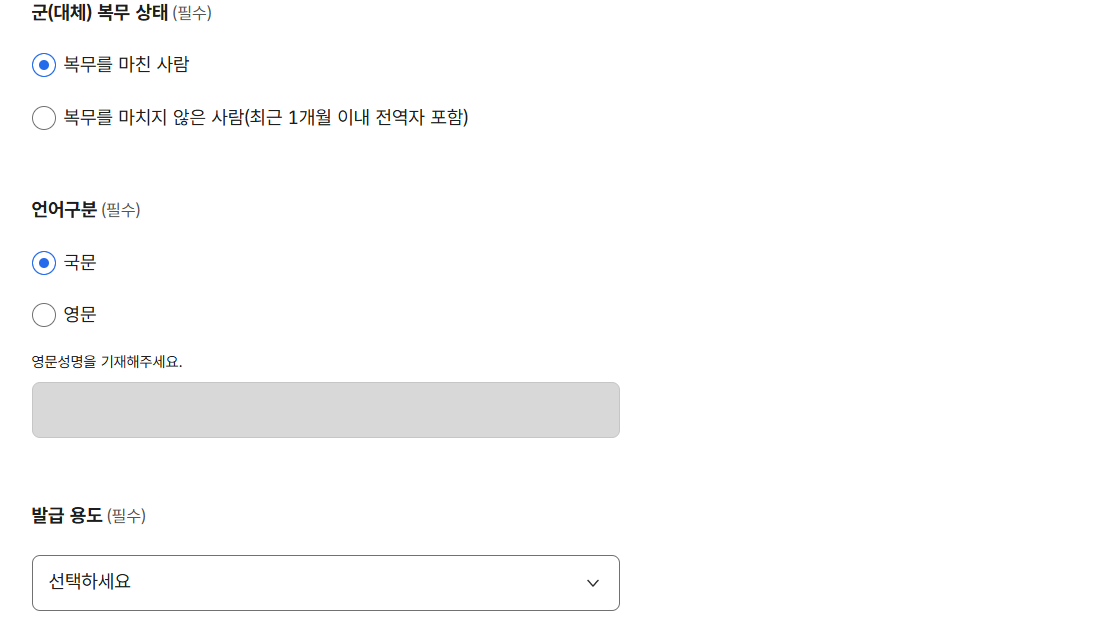 로그인 후 발급페이지로 넘어갔다면 자동입력된 부분은 제외 후 복무 상태, 언어, 발급 용도, 계급, 군번 등 사용 용도에 맞게 기재/미기재를 선택합니다.