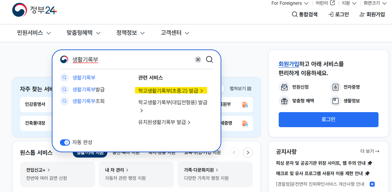 오늘은 정부24를 이용하여 중/고등학교 생활기록부를 조회해보고 발급하는 방법까지 알아보도록 하겠습니다.