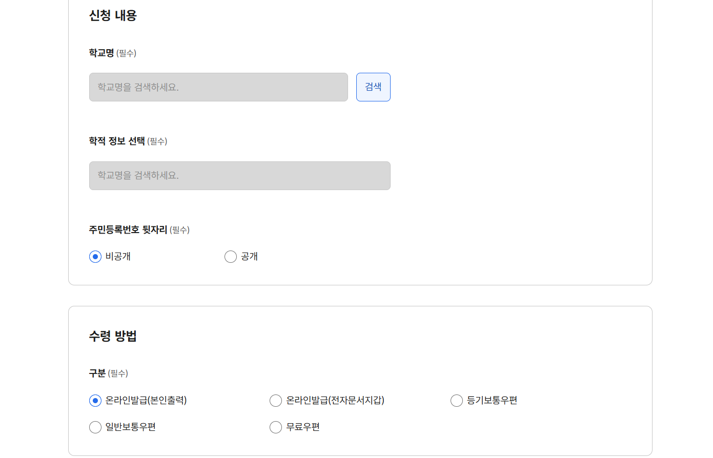 졸업한 학교를 검색 후 선택하고, 발급 방식은 온라인 발급(본인 출력)을 선택한 뒤 신청합니다.