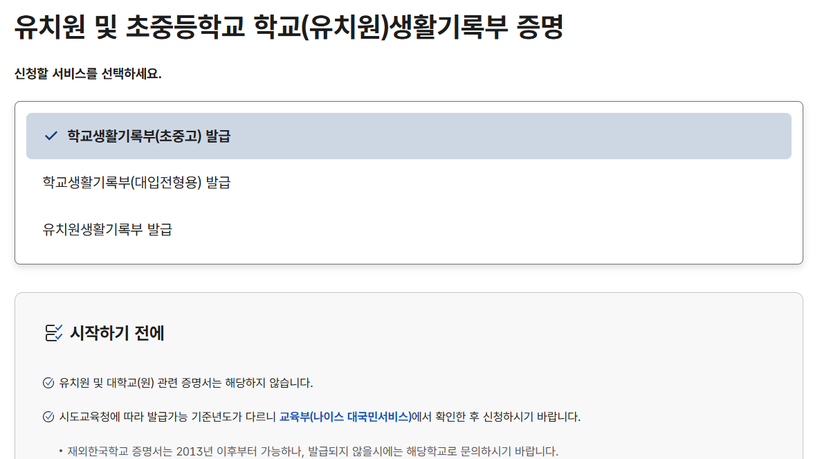 발급할 생활기록부를 선택합니다. 저는 초중고 생기부를 발급해보겠습니다.