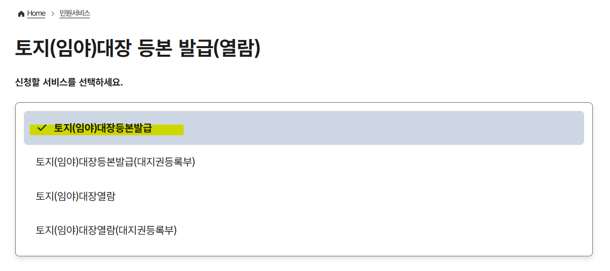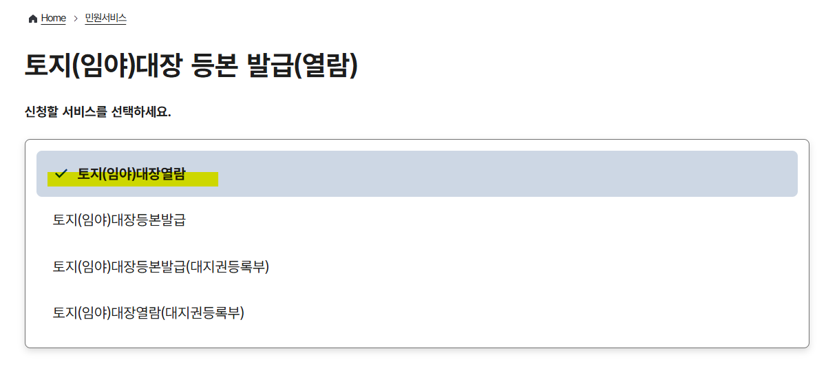 신청할 서비스에서 토지(임야)대장열람을 선택해주세요. 만약 발급을 하시고 싶다면 토지(임야)대장등본발급을 선택해주시길 바랍니다.