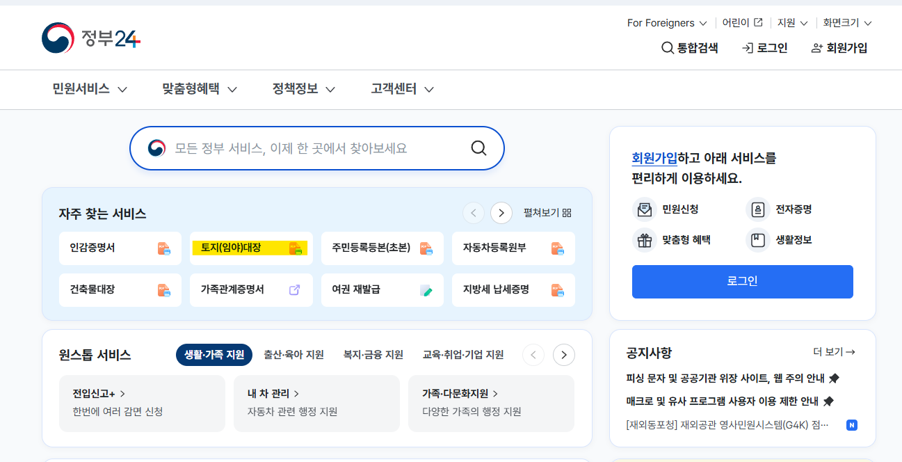 먼저 정부24 홈페이지에 접속하여 자주 찾는 서비스 목록에서 '토지(임야)대장'을 선택합니다.