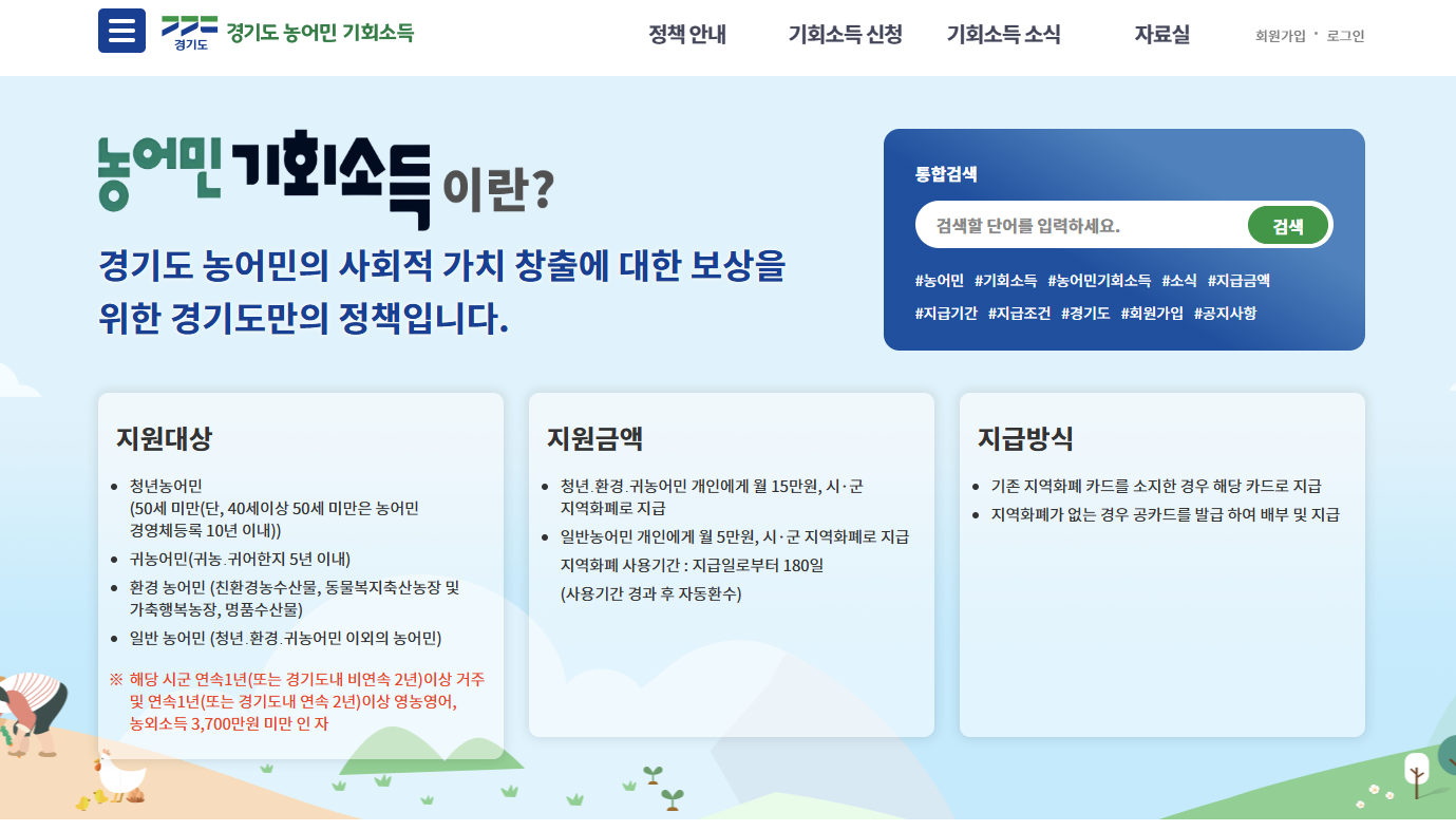 모든 국민이 공유하는 농촌환경 보존과 식량공급 역할을 하고 있는 농민을 대상으로 경기도에서 새롭게 도입하는 기본소득 제도로, 일정 요건을 충족하는 농민에게 정기적으로 현금성 지원을 제공하여 농업의 지속 가능성을 높이고, 농민들이 안정적인 소득을 확보할 수 있도록 돕는 지원 사업입니다.