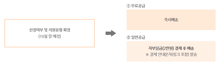 선정 여부와 지원유형은 10월 말에 확정되며, 무료공급 대상자는 즉시 배송되고, 일반공급 대상자는 결제 안내문자를 받은 후 결제 완료 시 배송됩니다.