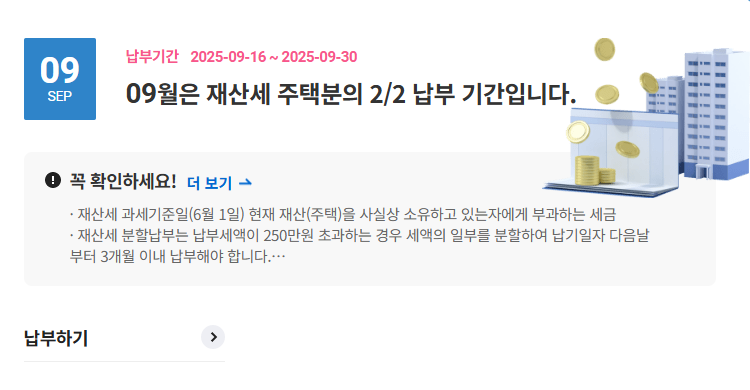재산세는 고지된 달의 16일부터 말일까지 납부할 수 있습니다. 특히 9월은 주택분 2차 고지와 함께 토지분 세액이 추가로 부과되는 시기입니다. 건축물은 일반적으로 7월에 고지되며, 토지는 9월에 고지되는 경우가 많습니다