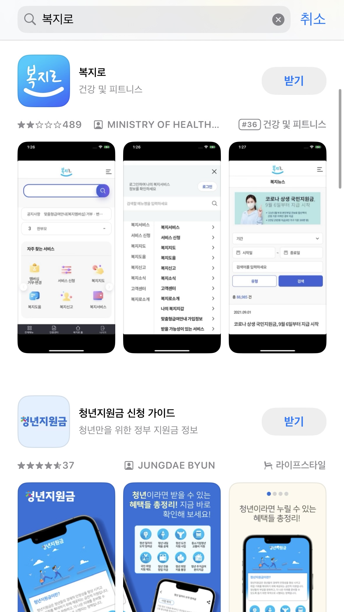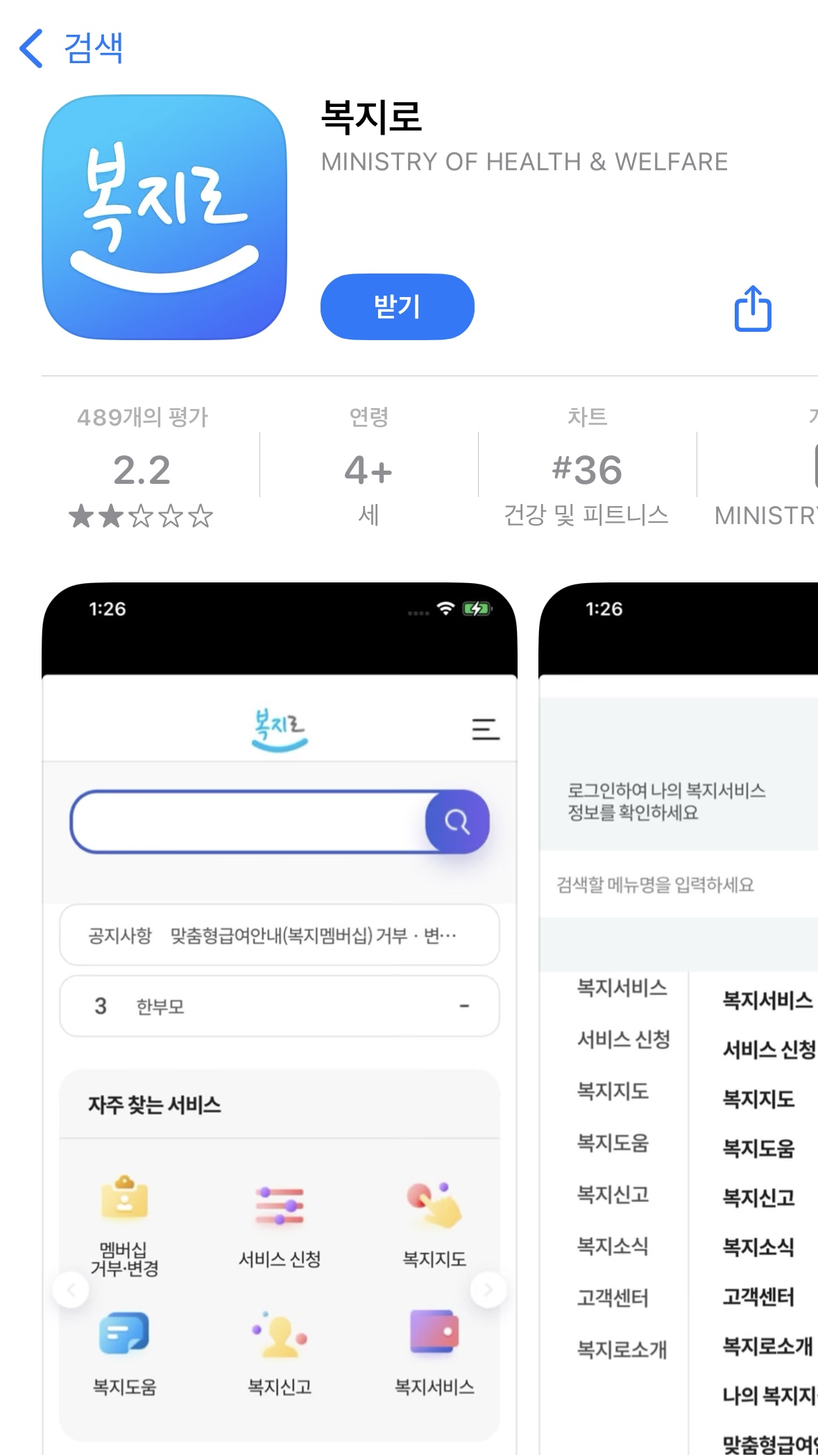 앱스토어에서 복지로 앱 다운로드를 하고 회원가입 및 로그인 진행합니다.